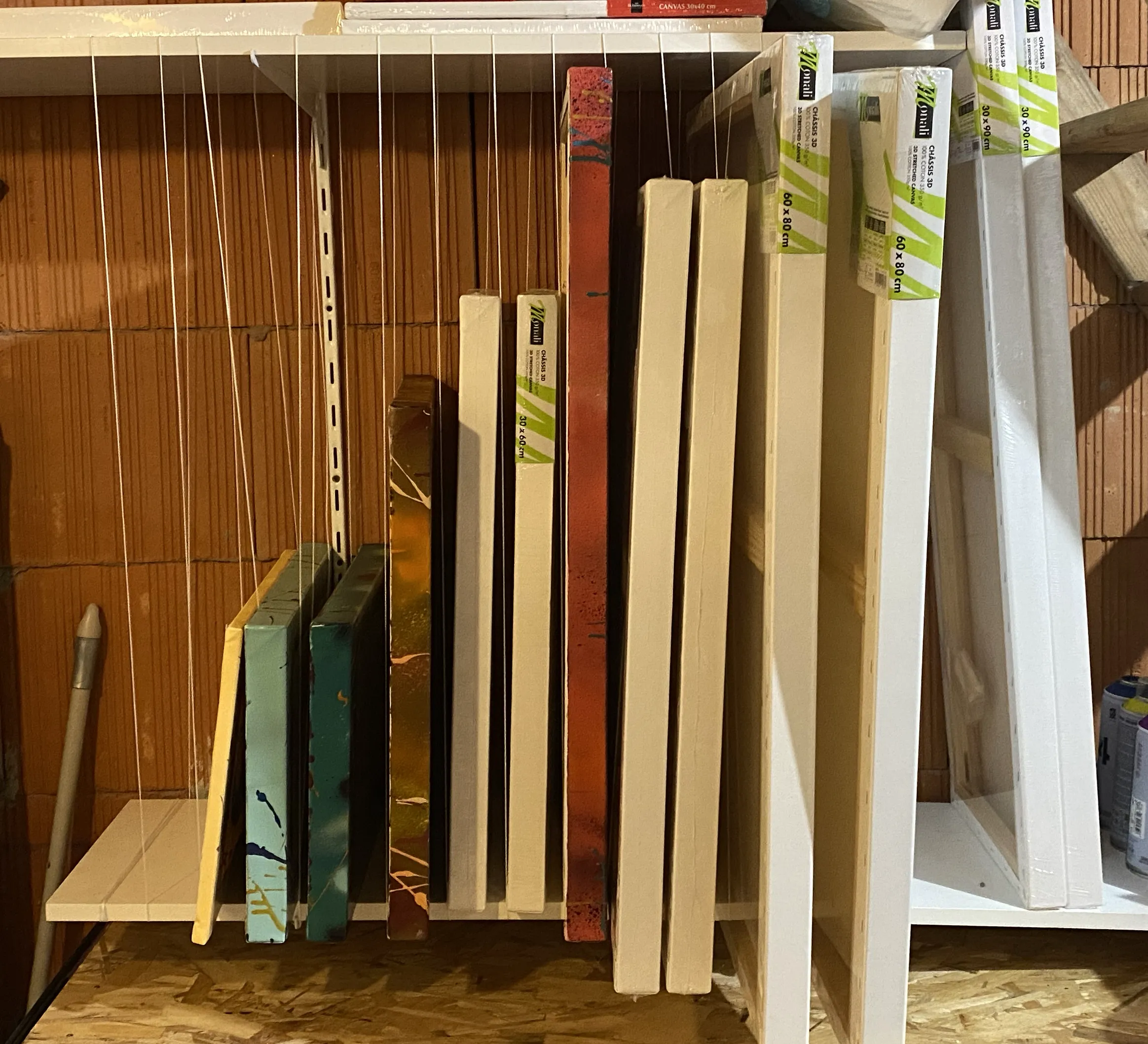 Au départ, j’avais besoin d’une solution rapide, économique et facile à mettre en place. L’idée était de créer des intercalaires verticaux pour éviter que les toiles ne se touchent entre elles.